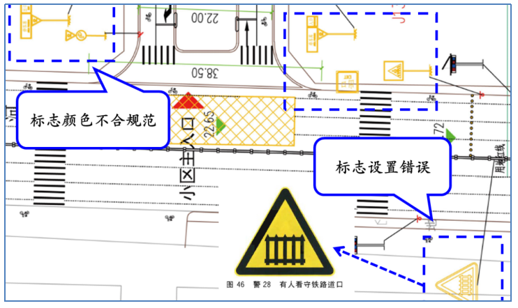 (三)交通安全设施设置方面交通安全设施设置可以提高参与者交通通行的舒适性,有效减少事故的发生,避免事故造成的损失交通安全设施设置不规范会增大交通事故发生的风险一是,交通标志标线设计不规范如部分标志设置位置、样式、颜色、文字等不符合规范要求,地面交通标线设计与实际交通运行不符等,为后期项目运行带来了一定的交通安全隐患。