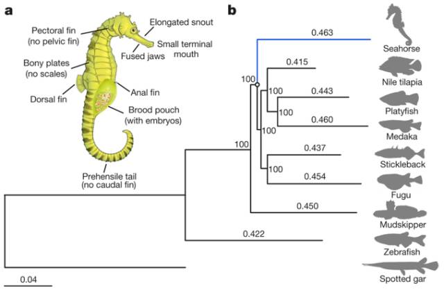 图片来源:http://www.nature.com/(导读 郭思瑶) 海马形态独特,嘴呈管状口内无齿,身披骨板,雄性具育儿囊,尾鳍和腹鳍缺失研究人员对虎尾海马(Hippocampus comes)基因进行了测序与从头合成,通过比较基因组分析,发现了一系列与这些特殊形态相关的基因表达。
