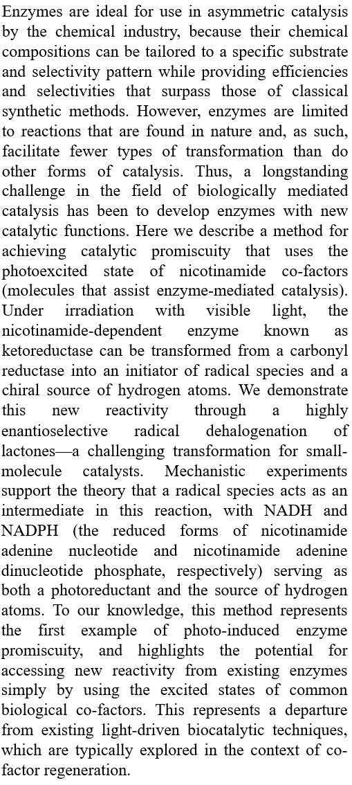 生物催化过程中光子诱导的混杂性图片来源:Nature(导读 韩宇) 酶作为理想的催化剂仅存在于天然反应中,新催化功能的开发仍面临诸多困难烟酰胺辅酶是一种羰酰还原酶,本文中利用可见光对其进行激发,使之获得了非天然的催化功能,可以催化内酯类分子的高对映性脱卤反应。