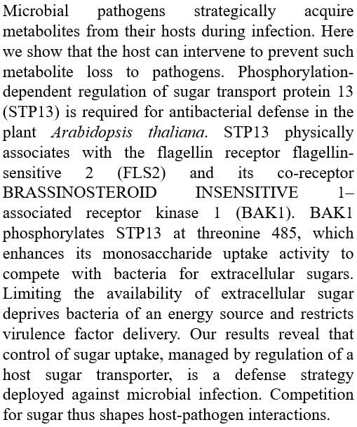 拟南芥糖转运蛋白活性对抗菌防御的调控Kohji Yamada, Yusuke Saijo, Hirofumi Nakagami, Yoshitaka Takanohttp://science.sciencemag.org/content/354/6318/1427