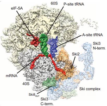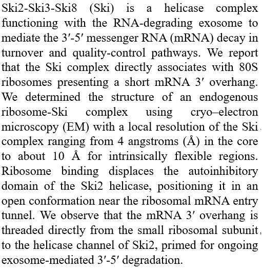 图片来源:sciencemag(导读 峰子) ski2-ski3-ski8(ski)解旋酶复合物同外切酶体一同调控细胞内错误或受损的mRNA的降解过程本文利用冷冻电镜解析了内源性核糖体-ski复合物的结构,发现核糖体的结合可以使ski2解旋酶的自抑制结构域易位,而mRNA的3′突出端可直接从核糖体小亚基穿过直至ski2的解旋酶通道,为下一步被外切酶体降解做准备。
