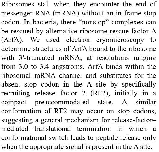 本文利用冷冻电镜得到与3’截短mRNA结合的ArfA的结构,发现ArfA会特异性地招募释放因子2(RF2)而终止密码子也会形成类似RF2的构象,暗示了一种释放因子调节翻译终止的通用机制 Abstract