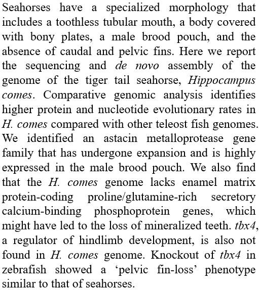 基因组学GenomicsThe seahorse genome and the evolution of its specialized morphology海马的基因组和其独特形态的演变Qiang Lin(林强,中科院南海所), Shaohua Fan, Yanhong Zhang…Axel Meyer & Byrappa Venkatesh