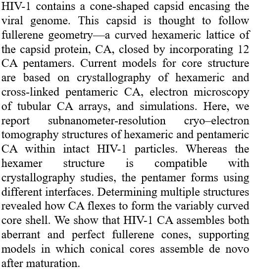 The structure and flexibility of conical HIV-1 capsids determined within intact virions完整HIV-1病毒粒子中锥形衣壳的结构和灵活性确认