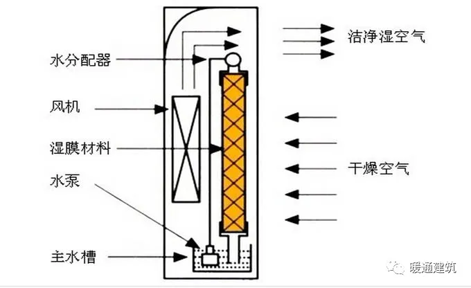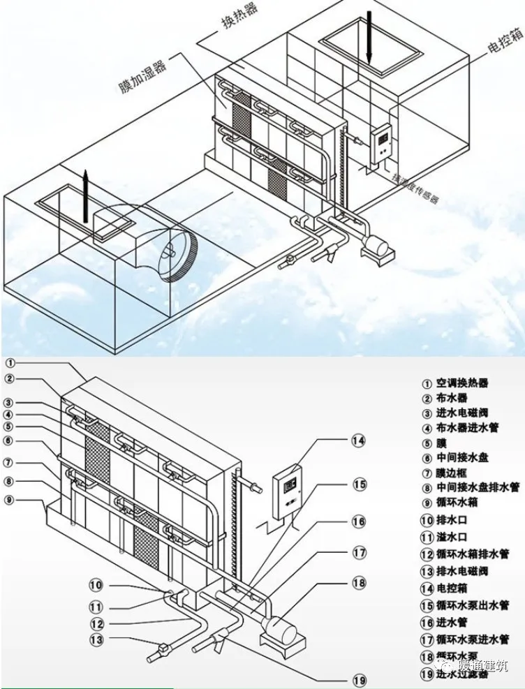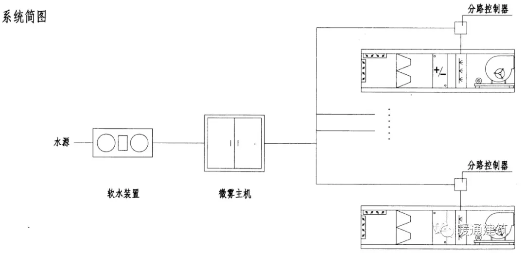空调系统常见的加湿方式常见有湿膜加湿、高压喷雾加湿、高压微雾加湿、干蒸汽加湿、电热加湿、电极加湿、间接蒸汽加湿、超声波雾化加湿等。 湿膜加湿原理:湿膜加湿的原理是将水送至湿膜顶部水分配器,水在重力作用下对湿膜淋水润湿,将穿过湿膜的空气进行加湿。根据水在湿膜内的循环方式湿膜加湿分为直排式和循环式。直排式:将未蒸发的水直接排走。 当加湿给水为生活饮用水没有做软化处理时,建议采用直排式,排水管接排水明沟或者机房地漏。循环式:配备循环水箱和循环水泵未蒸发的水从湿膜上流入循环水箱,再由循环水泵再次送到湿膜顶部。对于循环式,当循环水箱内的水循环一定时间后,水中离子及杂物浓度升高,需通过水箱的排水口将水排出,再清洗水箱置换干净的水,保证循环水和被加湿的空气不被二次污染。当加湿给水为经过处理的软化水或者纯净水时,建议采用循环式。 优点:初投资少,高效节能,具有降温、洁净空气的功能,噪音低,对水质无特殊要求(纯净水、软水、城市自来水均可)。同时湿膜加湿具有耗电量低、初投资及运行费用低的优点。缺点:湿膜加湿效率不高,一般在30%~50%之间,容易产生微生物污染,在空气含尘量较大的低区长期运行也会产生固体颗粒粉尘堆积的情况,需要定期清洗。适用领域:程控机房、计算机房、造纸车间、烟草加工车间、电子生产车间等。湿膜加湿适用相对湿度值要求不高或控制精度要求不高的场合,一般用在舒适性空调系统中居多。不适用于对卫生要求严格的空调区(如医院手术室等)。注意事项: 1)湿膜材料需无毒、抗菌、耐酸碱、耐霉菌、阻燃。常见的有织物纤维、玻璃纤维、金属等。2)湿膜给水可以采用生活饮用水和软化水,PH值宜为6.5~8.5。条件允许时尽量采用软化水,能延长湿膜加湿器的使用寿命。3)加湿水不得加入任何添加剂。4)湿膜加湿段位于空调机组机箱的负压区,当安装在风管中时,应位于风机的正压段。因为空气温度越高加湿效果越好,故湿膜加湿段一般位于加热段之后。5)根据产品要求确定迎面风速,且加湿之后应设置挡水板。6)应选择有灭菌措施的产品,且应定期清洗。图示:  高压喷雾、高压微雾加湿高压喷雾加湿器是由一定压力(采用柱塞泵加压)的水(0.3~1.0MPa)经过喷嘴喷射使水雾化(水滴直径一般20~40μm)的加湿器。高压微雾加湿器是由一定压力(采用柱塞泵加压)的水(≥3.0MPa,最大可加压至15MPa)经过喷嘴喷射使水雾化(水滴直径一般1~15μm)的加湿器。具体安装技术要求可参照图集《空调系统用加湿装置选用与安装》16K310。高压微雾加湿系统包含变频器、控制屏、控制程序、可编程PLC逻辑控制器、增压泵、逻辑控制模块、系统水箱等,均安装在加湿主机箱内,另外还包括高压开关(电磁阀组)、压力传感器、湿膜挡水板、喷嘴及铜管等部件。设计要点: 1)应采用软化水。2)一台高压微雾加湿主机服务的区域或空气处理机组数量,按产品要求确定,但高压管不宜穿过人员长期停留的房间。3)选用的主机供水量和喷嘴出雾量不应小于所需加湿量的1.25倍。4)加湿段后设置专用微雾挡水板,底部设置集水盘和排水装置。5)加湿器一般配装在组合式空调机组或吊装空调机组内,由设备厂家集成在空调箱体中,也可单独配置喷雾/微雾系统。6)高压喷/微雾加湿为等焓加湿。7)采用纯净水、软化水(硬度≤100mg/L,PH=6.5~8.5),给水温4℃~55℃,给水压力0.1~0.5MPa。7)此类加湿装置宜安装在空调机组内,不宜装在风管内。图示 某高压微雾系统的控制图 高压喷雾加湿 高压微雾加湿蒸汽加湿1)干蒸汽加湿直接向空气中喷射干蒸汽的加湿器。一般当有稳定的蒸汽源时可考虑使用,加湿蒸汽的压力宜为0.05~0.07MPa。干蒸汽加湿迅速、均匀、稳定,并不带水滴,有利于细菌的抑制等特点。2)间接蒸汽加湿利用锅炉等生产的蒸汽作为热源,间接加热加湿器中的水,使之变成蒸汽的加湿器。优点:蒸汽加湿为等温加湿,空气无污染、易于控制,加湿吸收距离(水分从空气至完全被吸收之间的距离)短。 缺点:必须有特定的产生蒸汽装置,占用空间较大,雾粒较大,不能完全蒸发。