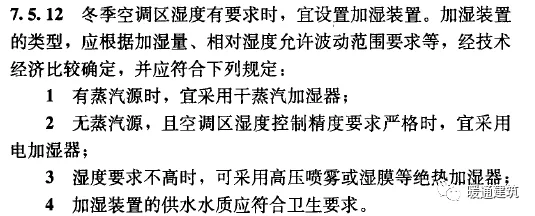 生活中,空气中的含湿量或者说相对湿度对人体舒适度至关重要,冬季室内空气相对湿度过低时,人体往往会出现干燥上火的症状,鼻部及呼吸道粘膜脱水,鼻出血,同时刺激喉部引发咳嗽也容易发生支气管炎、支气管哮喘等呼吸道疾病。因此室内空气相对湿度控制是空调系统设计的重要内容。 工业生产中,空气相对湿度过低容易导致静电积累,影响机械和电子设备的正常运行,尤其是纸张、胶片、计算机软盘及其它塑料制品的场所,静电积累尤为严重。同时过于干燥的空气还会导致纺织、木材、纸张、皮革等行业产品质量。空气过于干燥会产生静电并进而产生电火花易引发火灾,影响建筑及生产消防安全。因此,需要对空气中相对湿度进行控制,以满足生产生活需要是建筑环境设计里的一项重要内容。2 相关规范标准《建筑节能与可再生能源利用通用规范》GB55015-2021条文: 条文说明: 《民用建筑供暖通风与空气调节设计规范》GB50736-2012 国标图集:《空调系统用加湿装置选用与安装》16K310