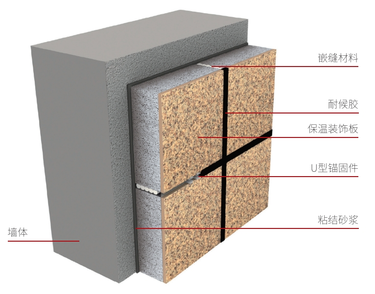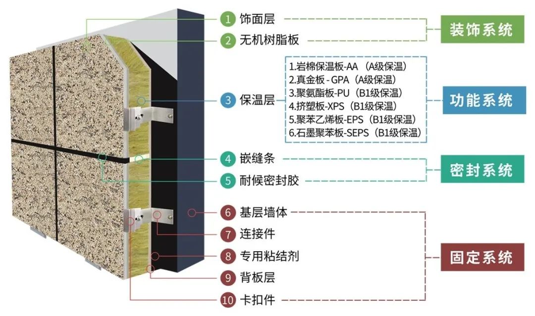 施工精度更高推荐使用铝模等高精度模板施工;当采用木模、钢模等模板技术时,采用专用的模板调平技术,可最大限度降低找平抹灰需求【03】无机保温装饰一体化板系统该系统是由保温装饰板、粘结砂浆、锚固件和密封胶等组成,采用粘结和锚固的固定方式,置于建筑物外墙外侧的保温装饰一体化系统。