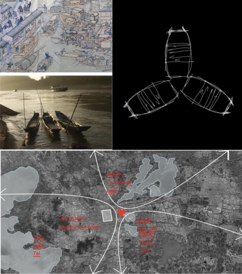 项目设计取义于舟船,也是财富聚集的象征苏州作为江南水乡的典范,大有运河太湖小到水道园林,水路并行的理念贯穿了苏州几干年的文化和生活方式项目设计三个塔瓣之间的开阔面分别朝向太湖水系、阳澄湖水系、金鸡独墅双湖水系,映射了苏州“三水绕城“的独特城市特质,同时顶部“花瓣绽放”的造型,也寓意着苏州未来的繁荣昌盛。