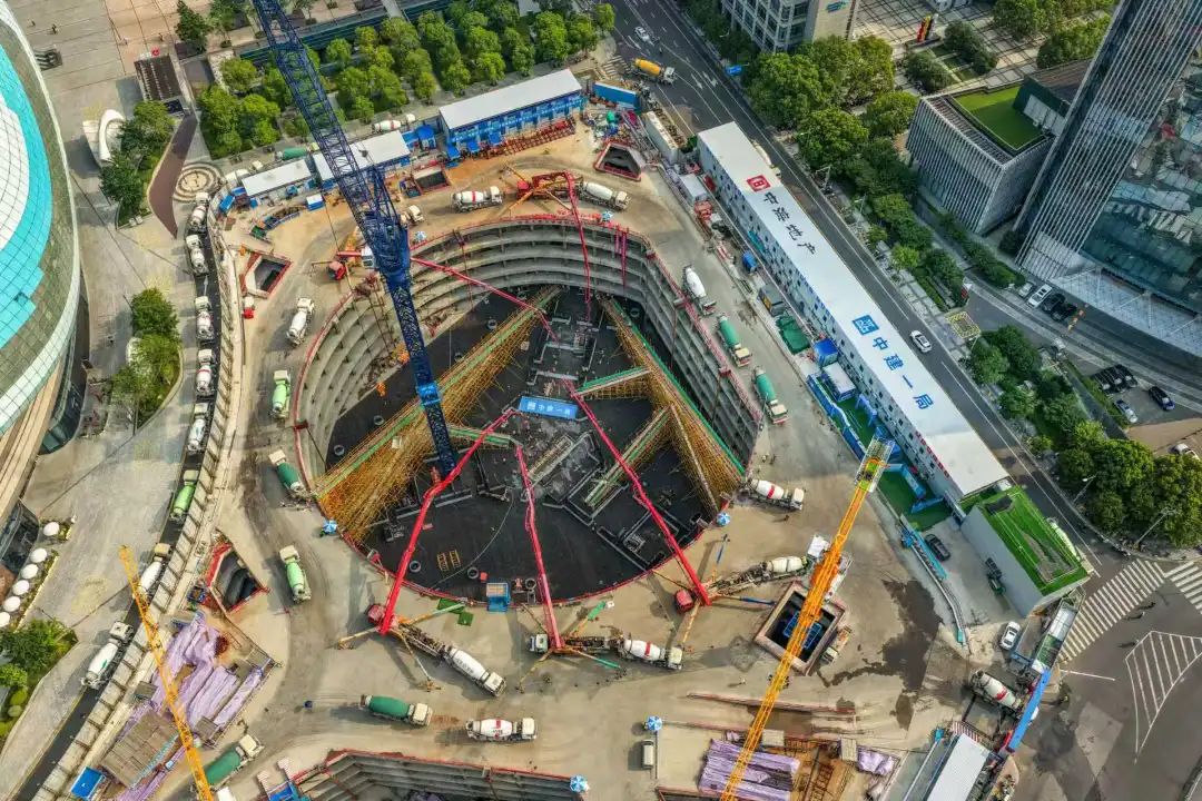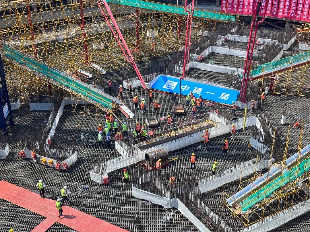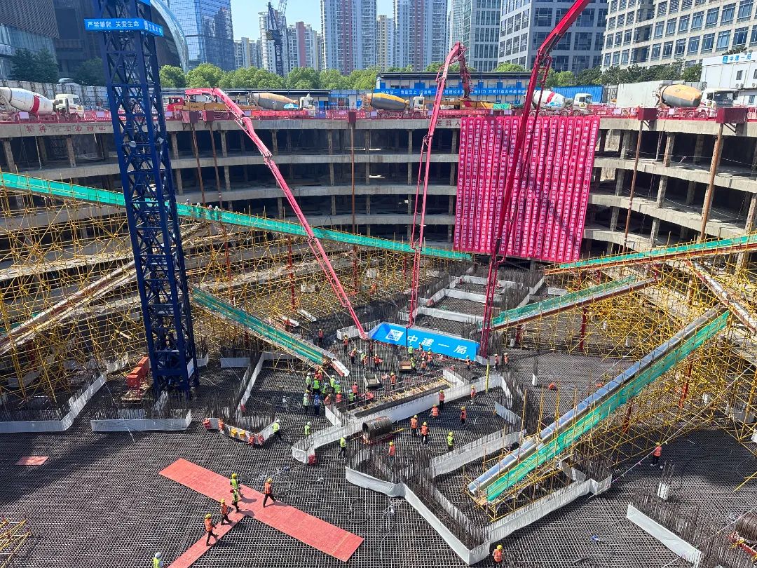 项目目前已完成桩基、基坑支护、土方开挖车库筏板施工等关键节点↓↓↓此次主塔楼大底板混凝土浇筑作为超塔建设的根基工程,具有体量大、作业周期长、工艺连续性要求高的特点,其底板普遍厚度4.5米,局部最厚处达8.05米