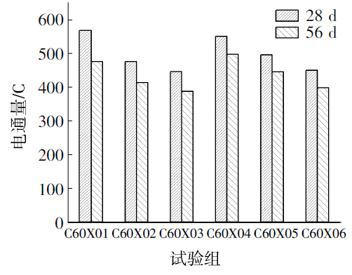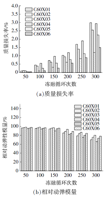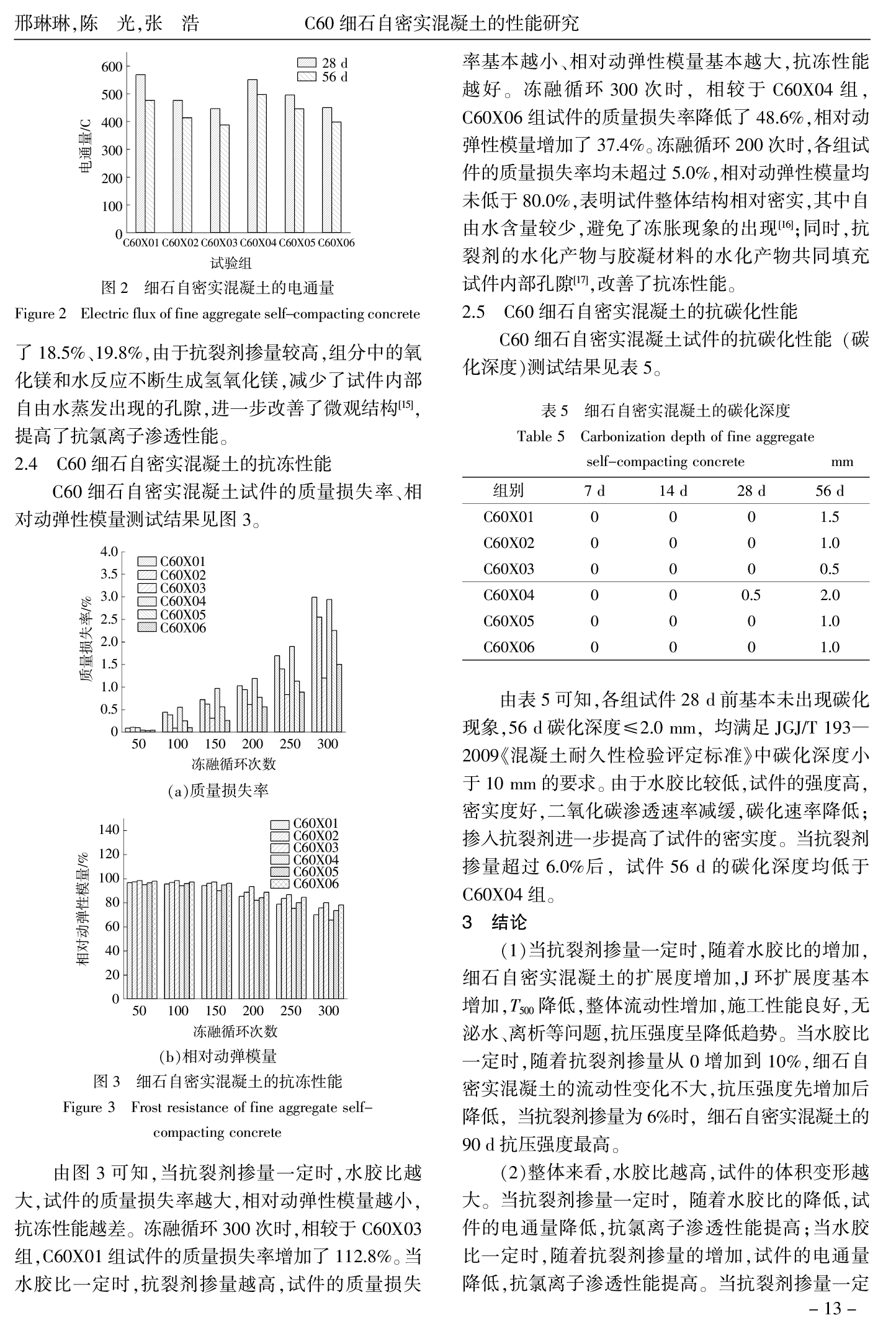 时,水胶比越大,试件的质量损失率越大,相对动弹性模量越小,抗冻性能越差;当水胶比一定时,抗裂剂掺量越高,试件的质量损失率基本越小、相对动弹性模量基本越大,抗冻性能越好此外,试件整体的碳化深度较低(3)当抗裂剂掺量为8.0%、水胶比为0.31时,C60细石自密实混凝土的抗裂性能良好,56 d电通量为412 C,300次冻融循环的质量损失率为1.8%,相对动弹性模量为76.0%,耐久性能良好。