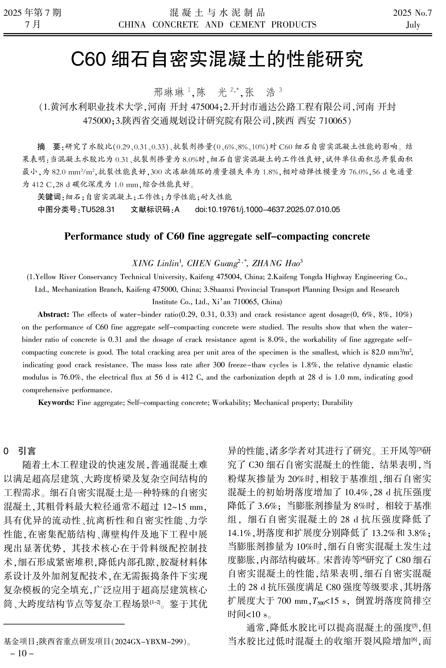 C60细石自密实混凝土的性能研究邢琳琳1,陈 光2,*,张 浩3(1.黄河水利职业技术大学,河南 开封 475004;2.开封市通达公路工程有限公司,河南 开封 475000;3.陕西省交通规划设计研究院有限公司,陕西 西安 710065