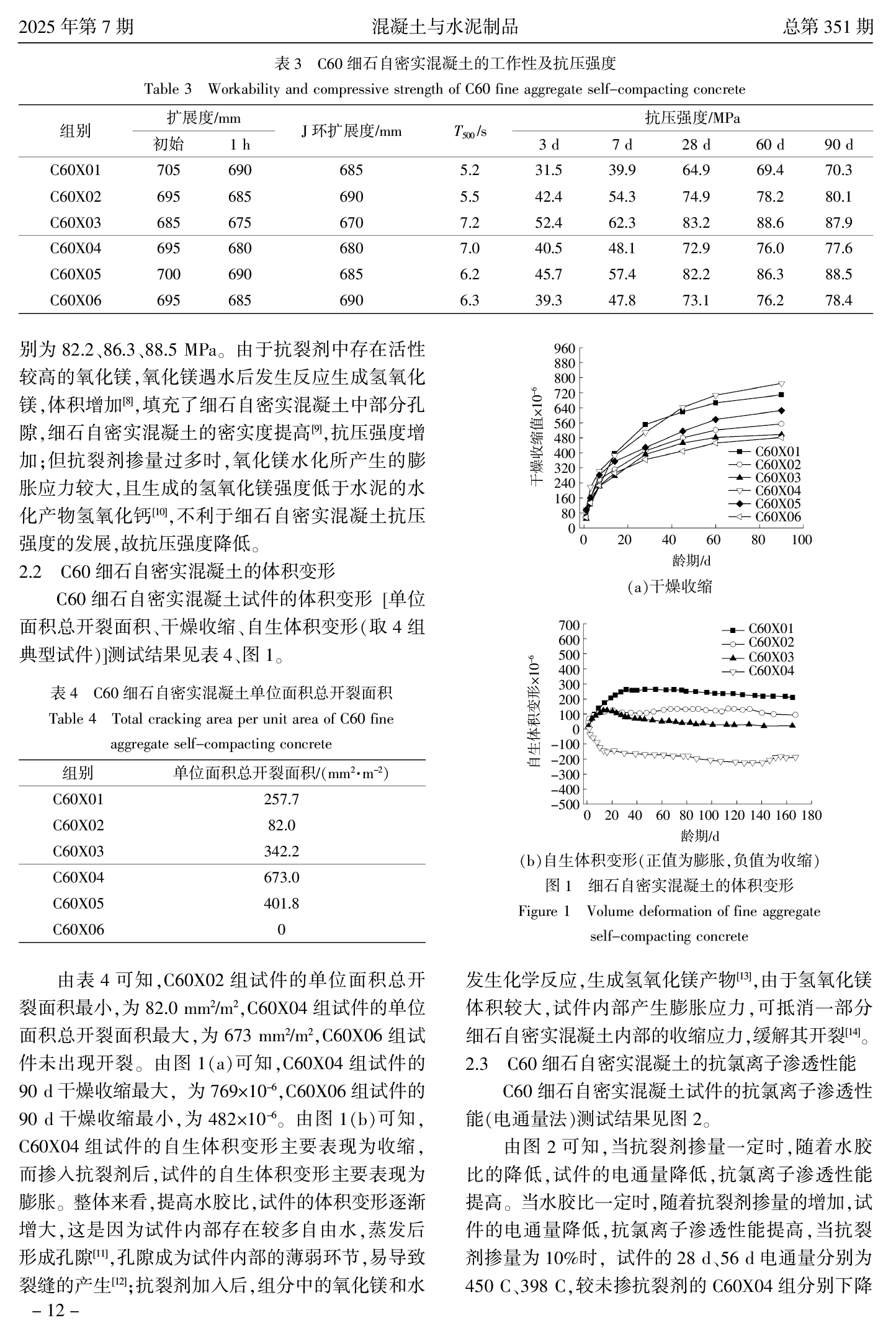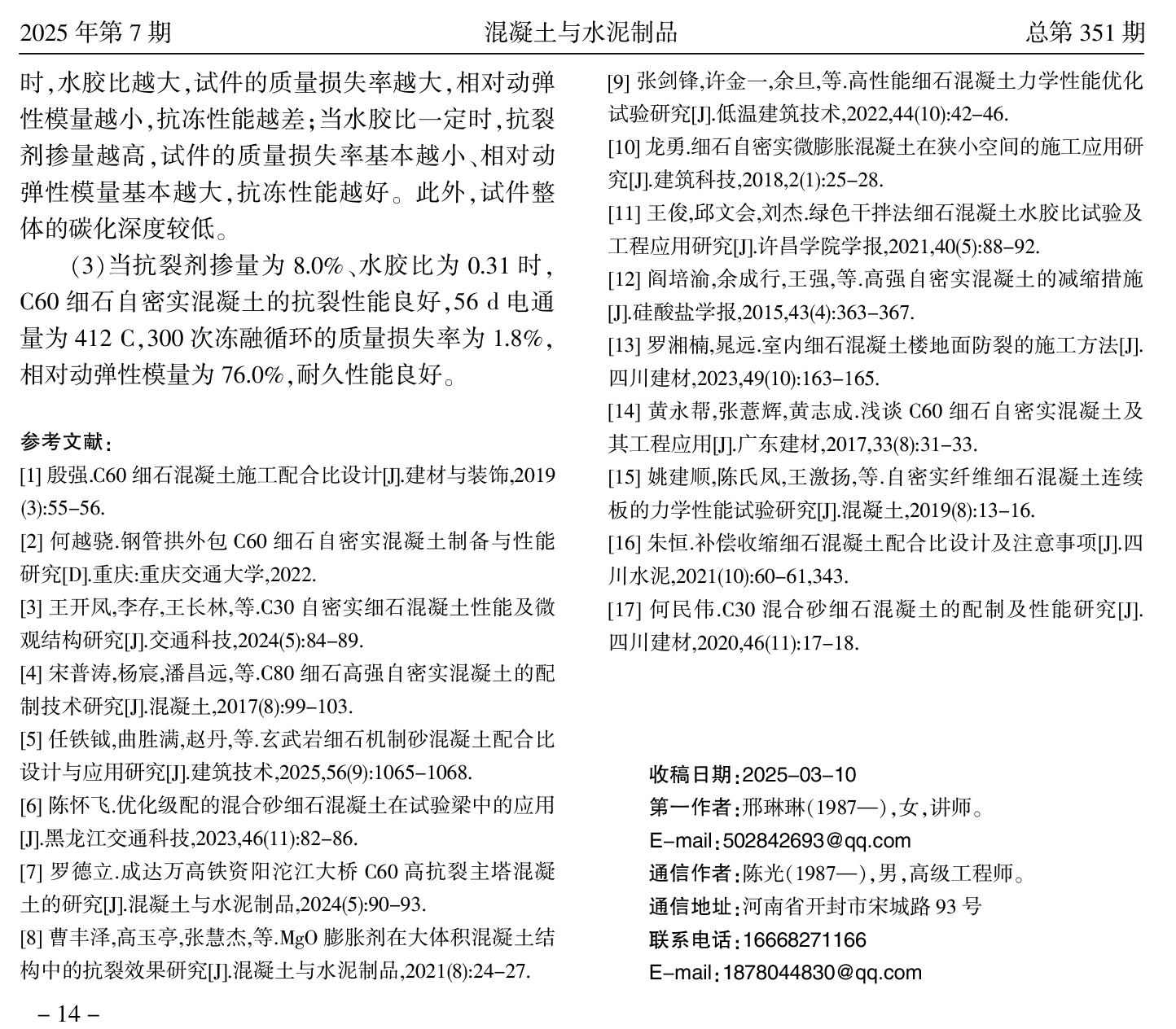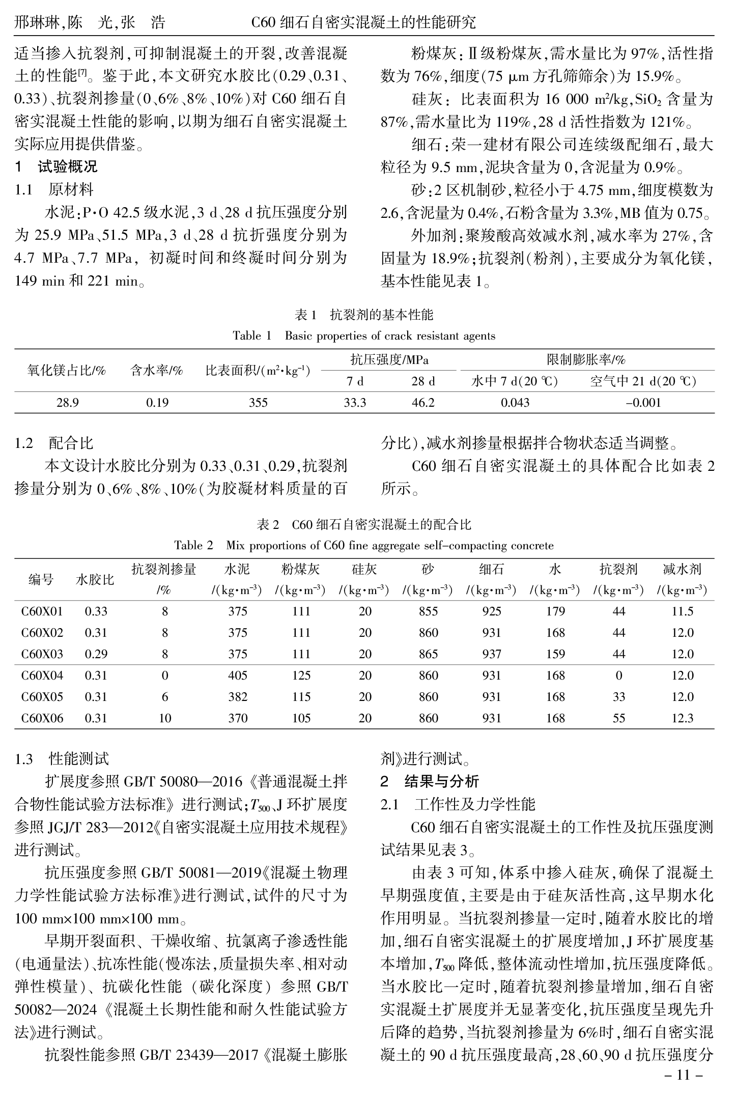 研究了水胶比(0.29、0.31、0.33)、抗裂剂掺量(0、6%、8%、10%)对C60细石自密实混凝土性能的影响 。
