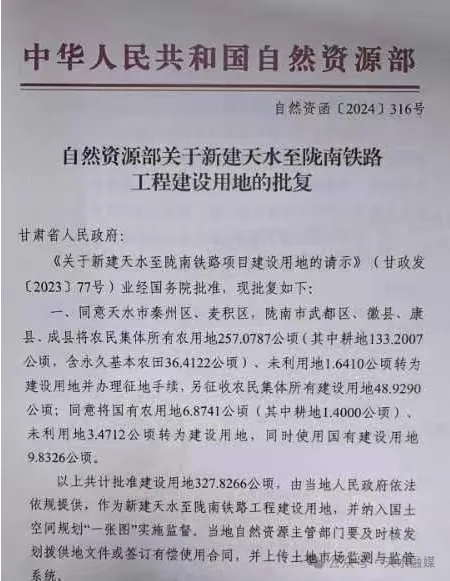 近日新建天水至陇南铁路建设项目建设用地经国务院批准并经自然资源部批复批复用地总面积327.8266公顷为项目全面依法依规建设提供了坚实保障标志着项目施工建设正式按下了“加速键”